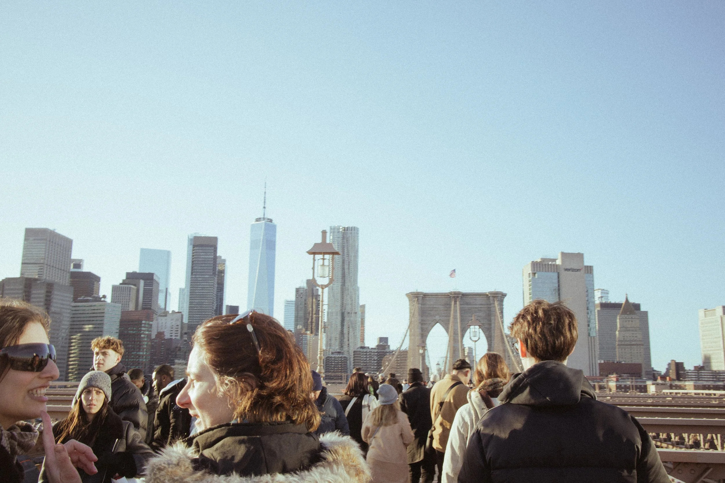 “A bustling Brooklyn Bridge pedestrian path in winter”