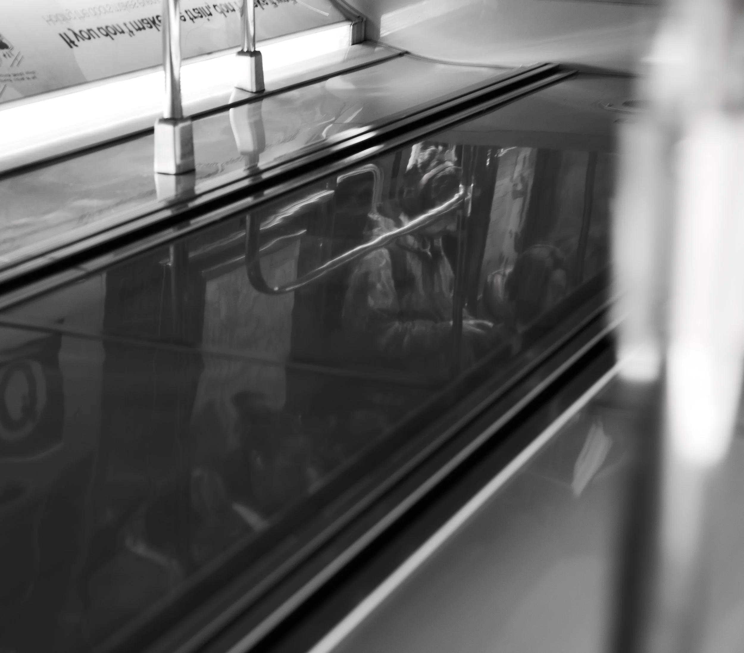 “The reflection from the subway roof, warping travelers as they are in transit”