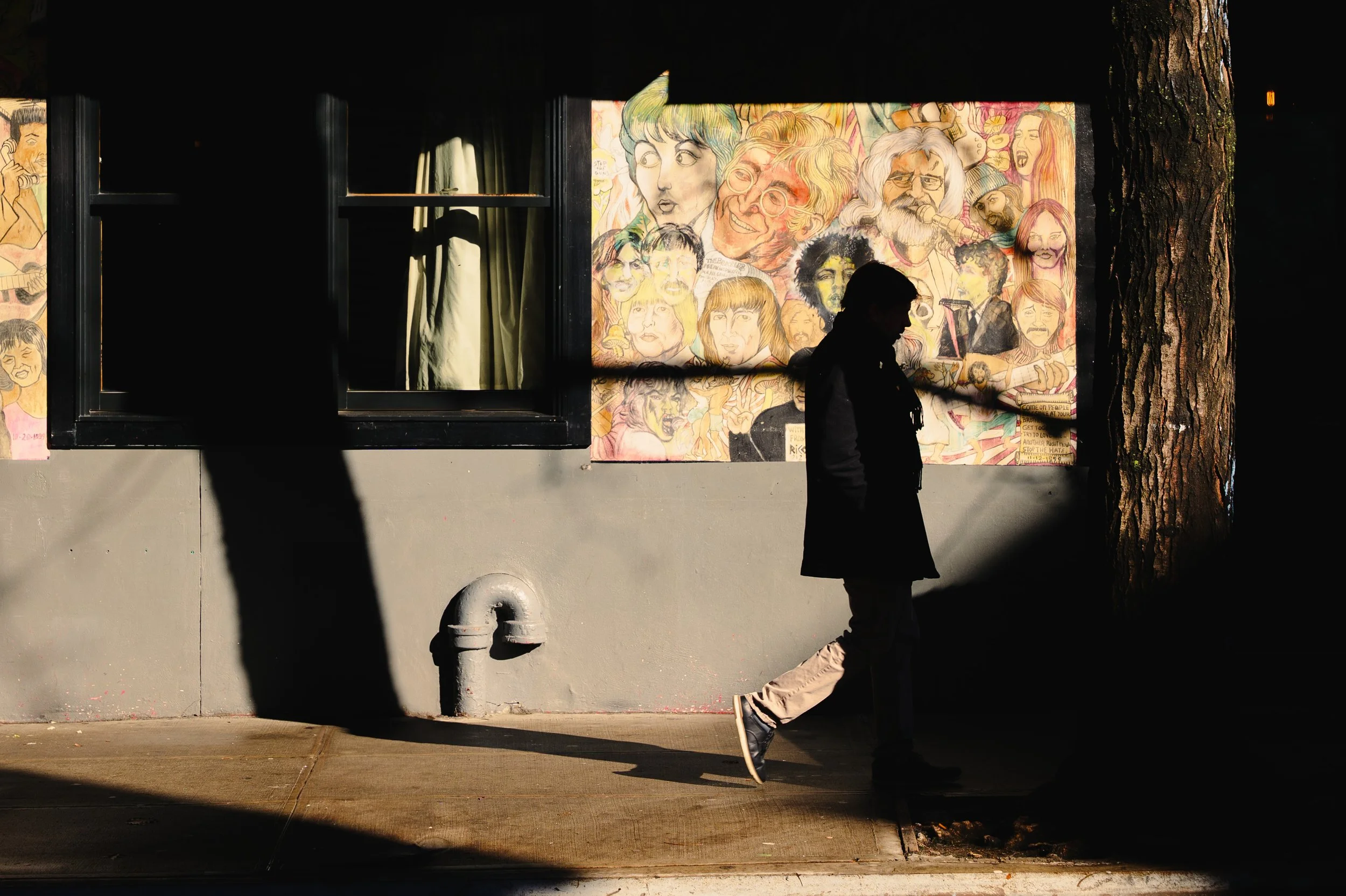 “A man hidden in the shadows against a mural on a harsh sunny day.”